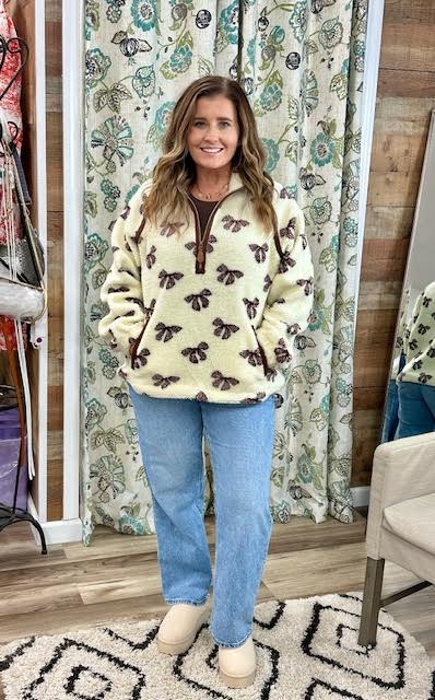 Snuggle up in the BIRDIE Bow Sherpa Pullover from Bird and Co.'s Birdie line! This warm, cozy pullover wraps you in a cloud of soft sherpa fleece, perfect for chilly days or lazy weekends. Its playful bow detail adds a cute twist while keeping comfort front and center—your go-to cuddle buddy for effortless style and snug vibes.