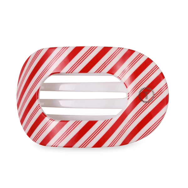 Lay flat and relax with the new TELETIES Candy Cane Crush Large Flat Round Hair Clip in Red and White Stripes. This hair clip is designed to allow you to lay back flat, do yoga, or sit comfortably in a seat with a headrest, and it is made with the same material that is nearly unbreakable.