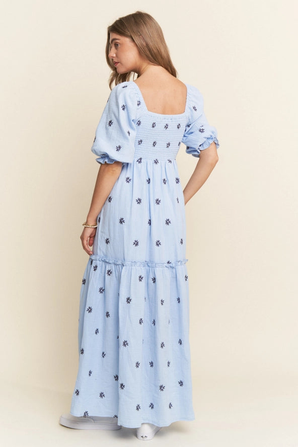 Flower embroidered pattern. Functional pockets. Half sleeve lenght. Smocked upper bodice. Maxi, square neckline. Spring dress. Summer dress.