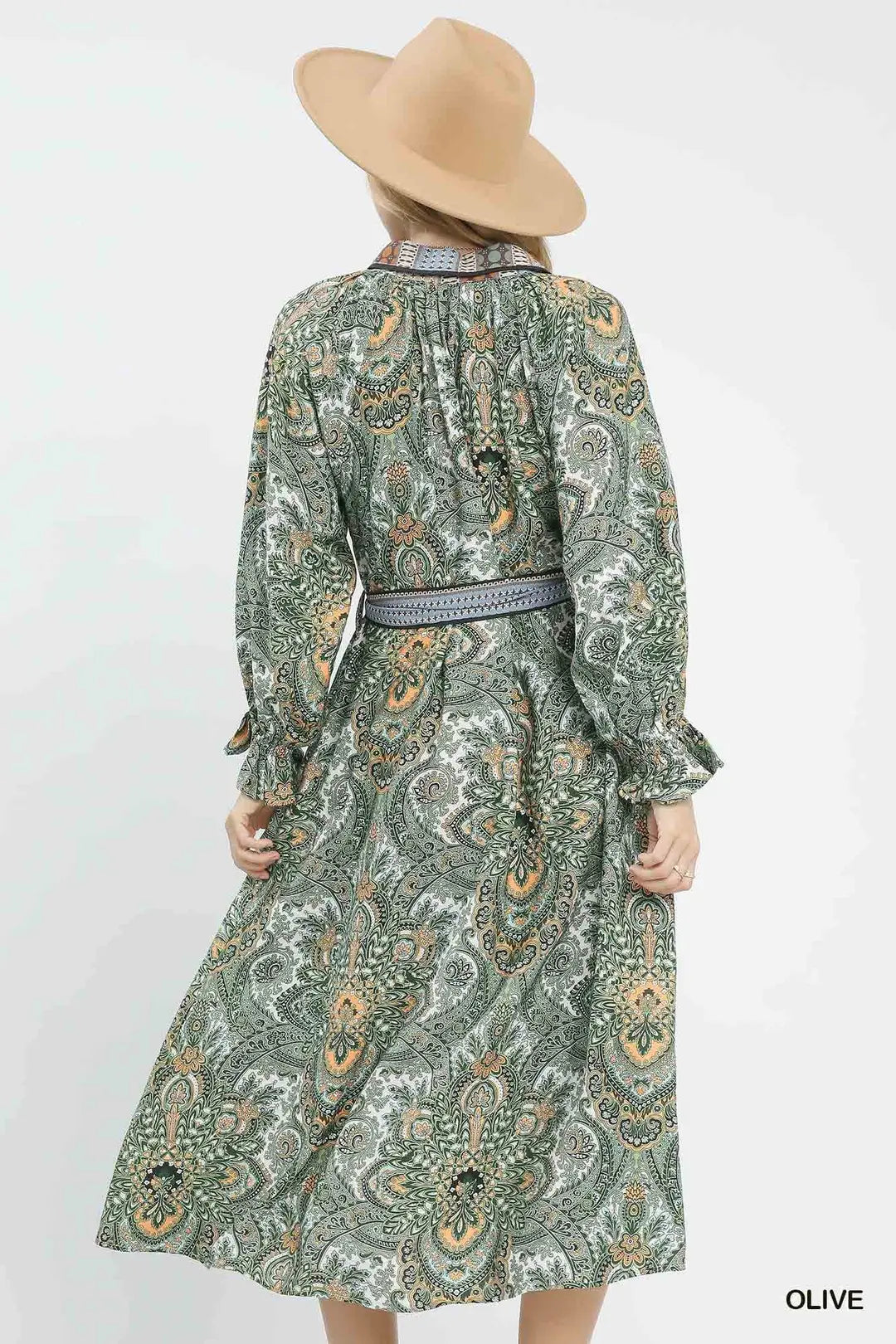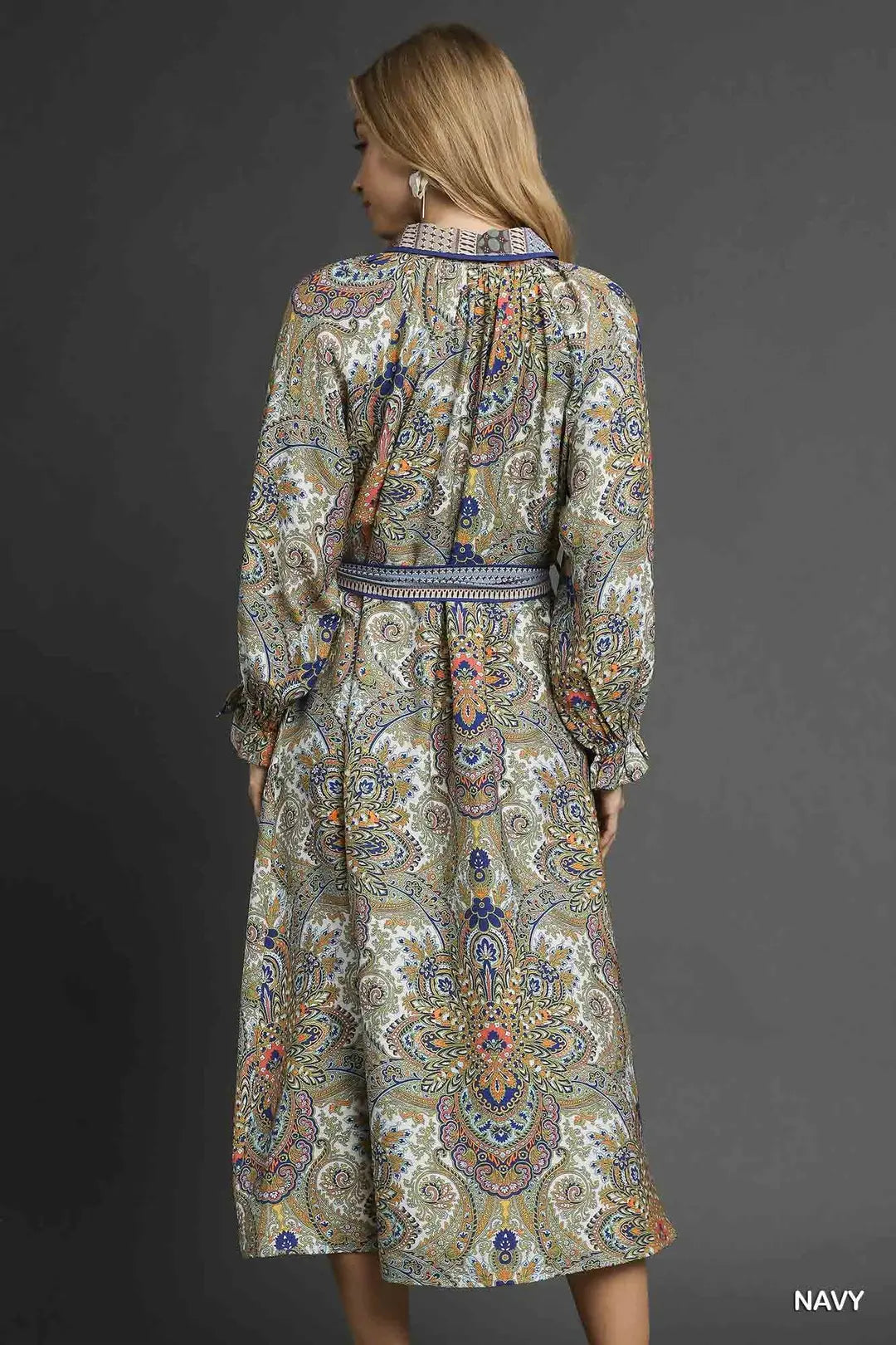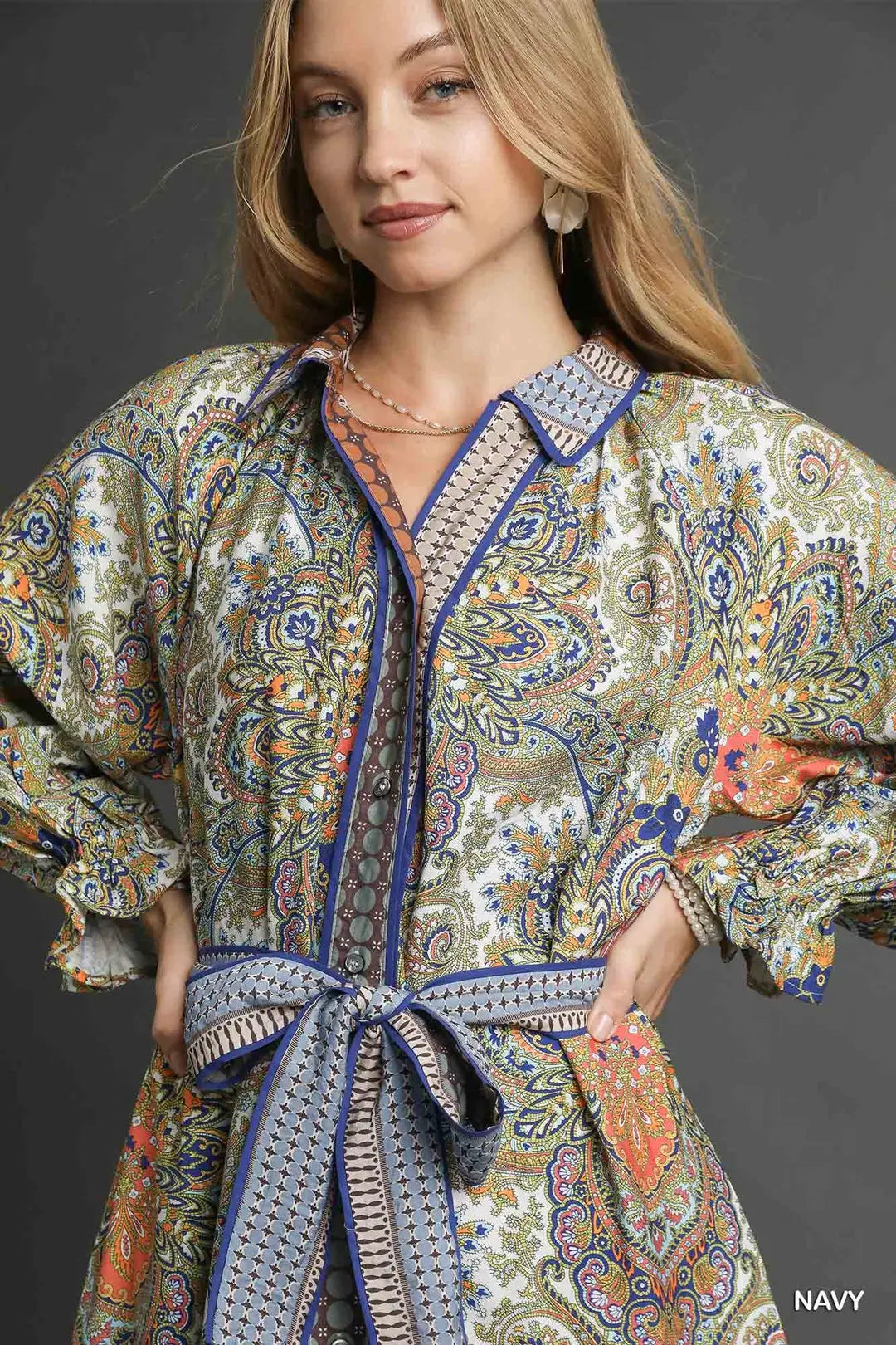 Step into sunshine with the Harvest Bloom dress—a playful midi shirt dress featuring a delightful mix of paisley prints effortlessly tied together with a chic belted waist. Light and breezy, it’s perfect for twirling through weekends or breezing into brunch with friends. Embrace the flow, color, and charm this dress brings to every step you take!